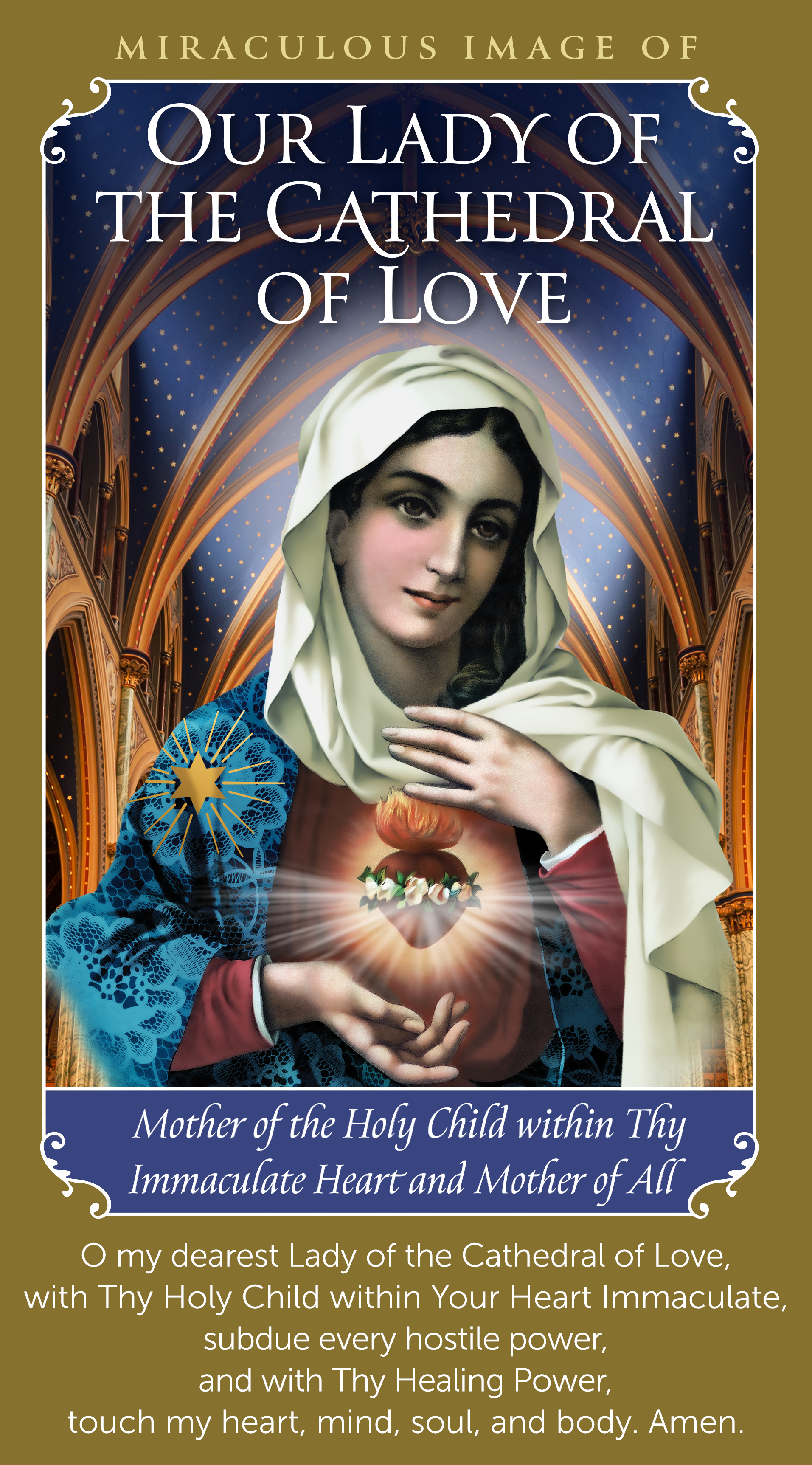 Most gracious and Loving Mother of Mercy, shower upon me the rays of your Immaculate Love from thy Immaculate Conception to set at liberty from me every indisposition. Instill in me a faithfulness to the end as I choose to be Your Child of the Cathedral of Love participating in the Life in the Two Loves which makes Life within Your Heart Beautiful. Blessed is the Seraphic Fare of your Love and His Love that produces for us a Life of harmony, and peace in the Cathedral of Love. Our hearts laden with the Two Loves are the breath of Life for the world, and a sign of Your all powerful intervention as Our Lady of the Cathedral of Love. My Lady of the Cathedral of Love obtain for me the request of this novena, and I promise an ardent adversity to sin, and an espousal to Jesus in Your Immaculate Heart.